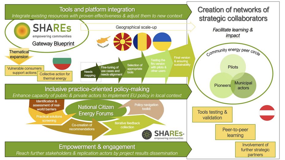 The SHAREs+ project advances citizen-led energy initiatives across Southeast Europe by leveraging frontrunner expertise, proven tools, and functional technical platforms. Building on the success of the SHAREs National Gateways, the project replicates this model in new geographical areas while enhancing it for additional use cases, ensuring long-term support for collective energy action beyond the project lifetime.